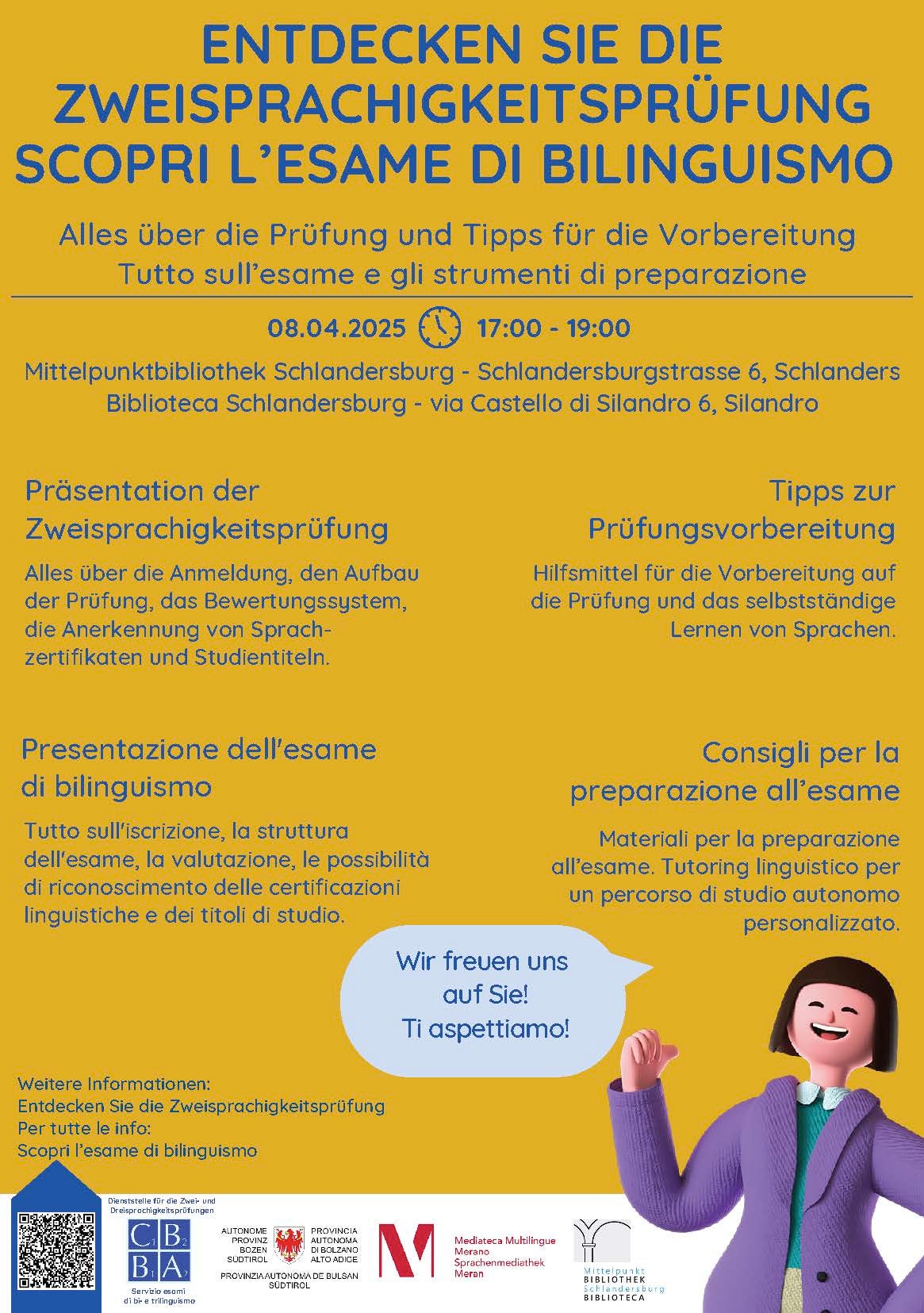 Im Anschluss gibt es einen Überblick über die Ressourcen und Angebote der Sprachenmediathek Meran, die im Allgemeinen zum selbstständigen Lernen einer Sprache und insbesondere zur Vorbereitung auf die Zweisprachigkeitsprüfung kostenfrei in Anspruch genommen werden können.